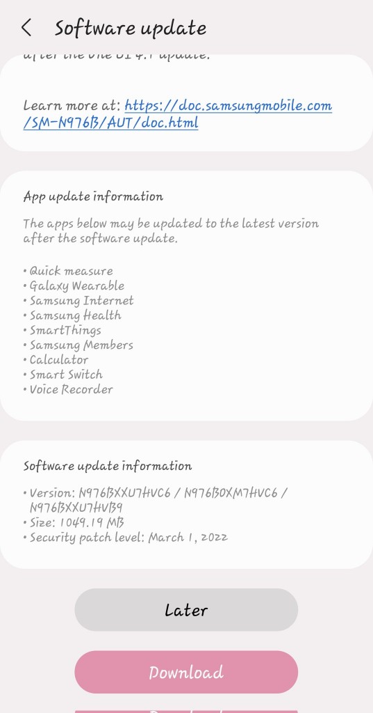 One UI 4.1 สำหรับ Samsung Galaxy S10 และ Galaxy Note 10 มีขนาดประมาณ 1,000MB เลขโมเดลอัปเดตคือ N976BXXU7HVC6 มาพร้อมกับอัปเดต Security Patch ประจำเดือนมีนาคมด้วย
