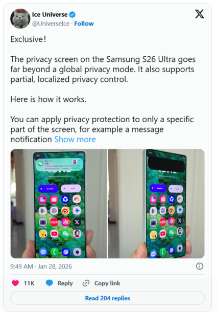 ก่อนหน้านี้ Tipster ชื่อดัง Ice Universe ได้เผยภาพตัวอย่างการทำงานจริง ซึ่งแสดงให้เห็นว่าการแจ้งเตือนจะมองไม่เห็นเมื่อดูจากด้านข้าง อย่างไรก็ตาม แหล่งข่าวเดียวกันระบุว่าฟีเจอร์นี้อาจจำกัดเฉพาะรุ่น Galaxy S26 Ultra เท่านั้น เนื่องจากเป็นเทคโนโลยีที่พึ่งพาฮาร์ดแวร์โดยตรง