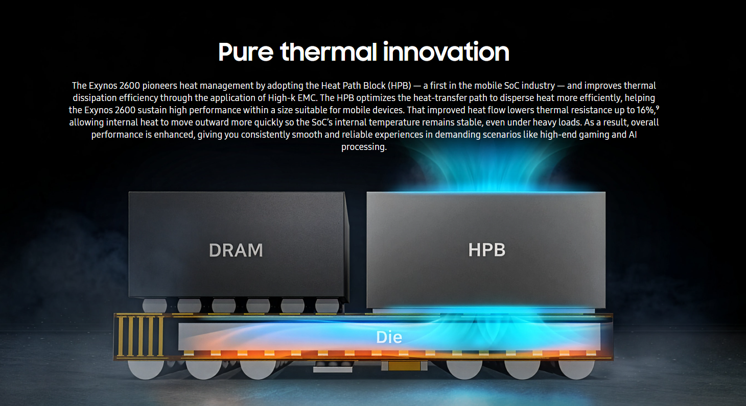 หนึ่งในจุดที่ Samsung พยายามแก้ไขมากที่สุดคือเรื่องความร้อน Exynos 2600 ใช้เทคโนโลยีใหม่ Heat Path Block (HPB) ร่วมกับวัสดุ High-k EMC วางลงบนตัวซิลิคอนหลักของชิปวงจรประมวลผลจริง ๆ ที่ทำงานและร้อนที่สุดช่วยลดค่าความต้านทานความร้อนได้สูงสุด 16% ทำให้ความร้อนระบายออกจากชิปได้เร็วขึ้น และช่วยรักษาประสิทธิภาพต่อเนื่องในระยะยาว