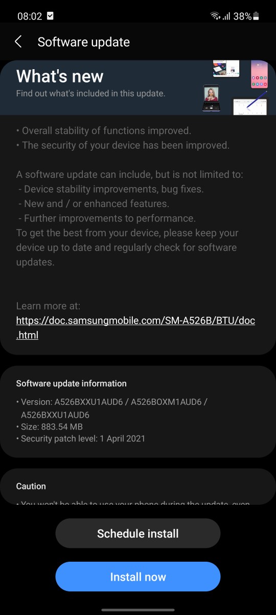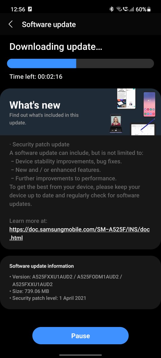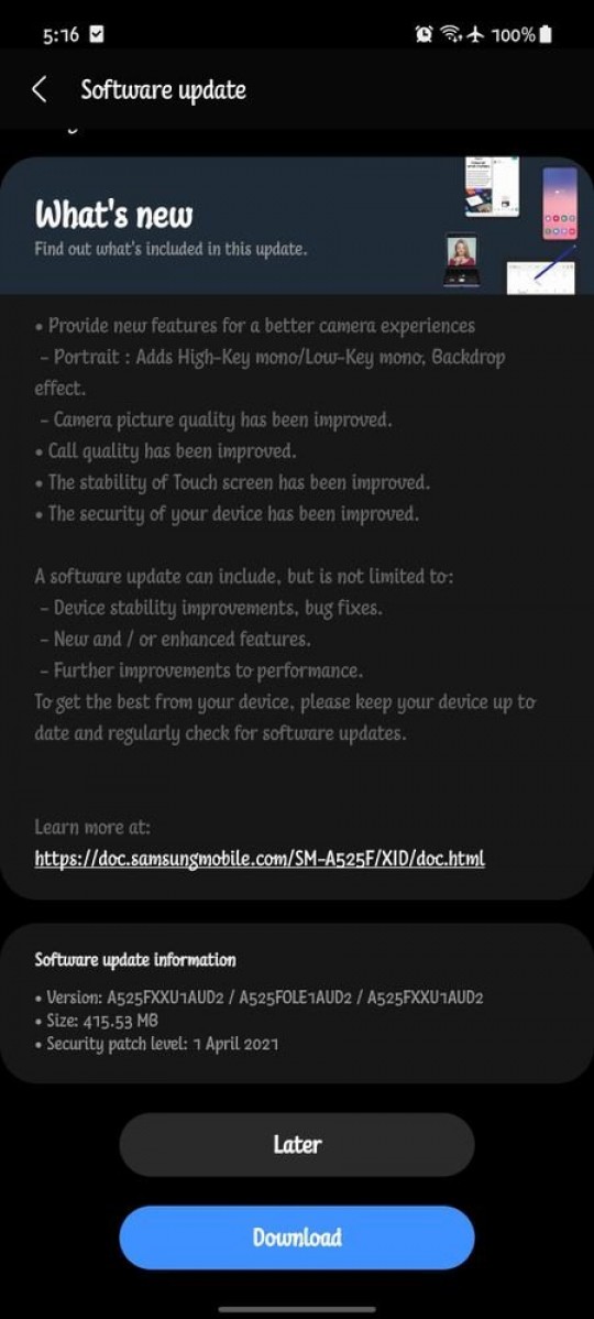 นอกจากนี้ การอัปเดตรหัส A525FXXU1AUD2 ยังปรับปรุงคุณภาพการโทรและความเสถียรของหน้าจอสัมผัส และแน่นอนว่ายังมีการปรับปรุงระบบความปลอดภัยหรือ Security Patch ประจำเดือนเมษายนมาด้วย โดยการอัปเดตครั้งนี้มีขนาดที่ไม่ใหญ่ เพียง 400 MB เท่านั้น