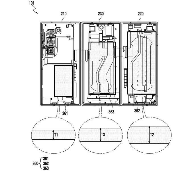 แทนที่จะใช้แบตเตอรี่แบบสองก้อนเหมือนใน Galaxy Z Fold รุ่นปัจจุบัน Samsung อาจเลือกวาง “แบตเตอรี่ 3 ก้อน” กระจายอยู่ในแต่ละส่วนของจอพับ ได้แก่