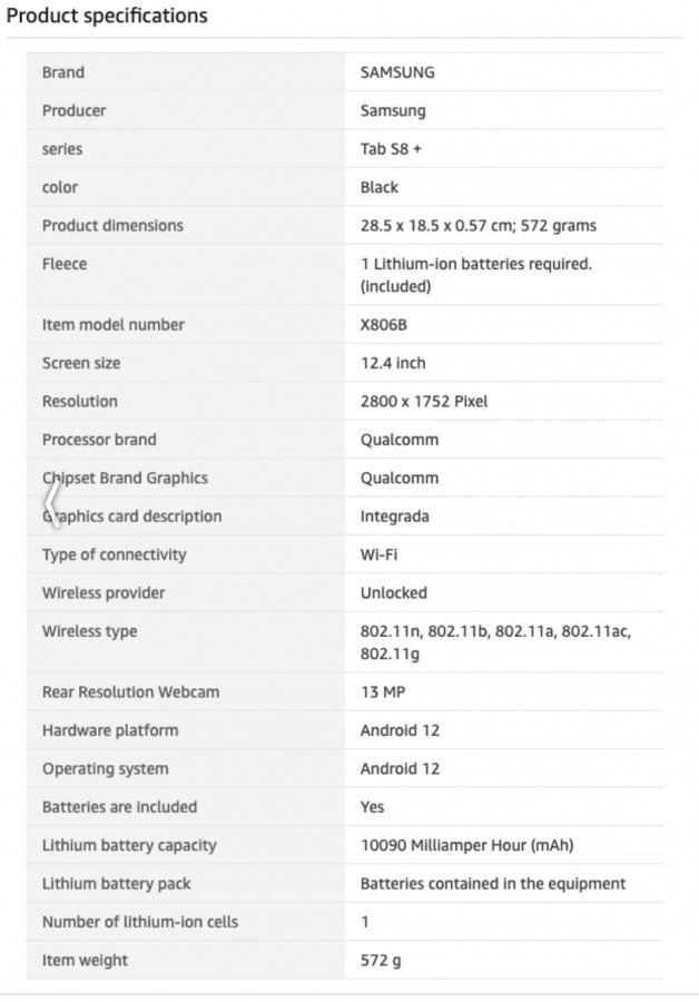 โดยทั้ง 3 รุ่นไม่ว่าจะเป็น Galaxy Tab S8, Galaxy Tab S8+ และ Galaxy Tab S8 Ultra จะมาพร้อมกับชิปเซ็ต Snapdragon 8 Gen 1, รันบน android 12 และมาพร้อมกับหน้าจอ 3 ขนาดตั้งแต่ขนาด 11 นิ้ว, 12.4 นิ้วบนรุ่น Tab S8+ และ 14.6 นิ้วบนรุ่น Ultra