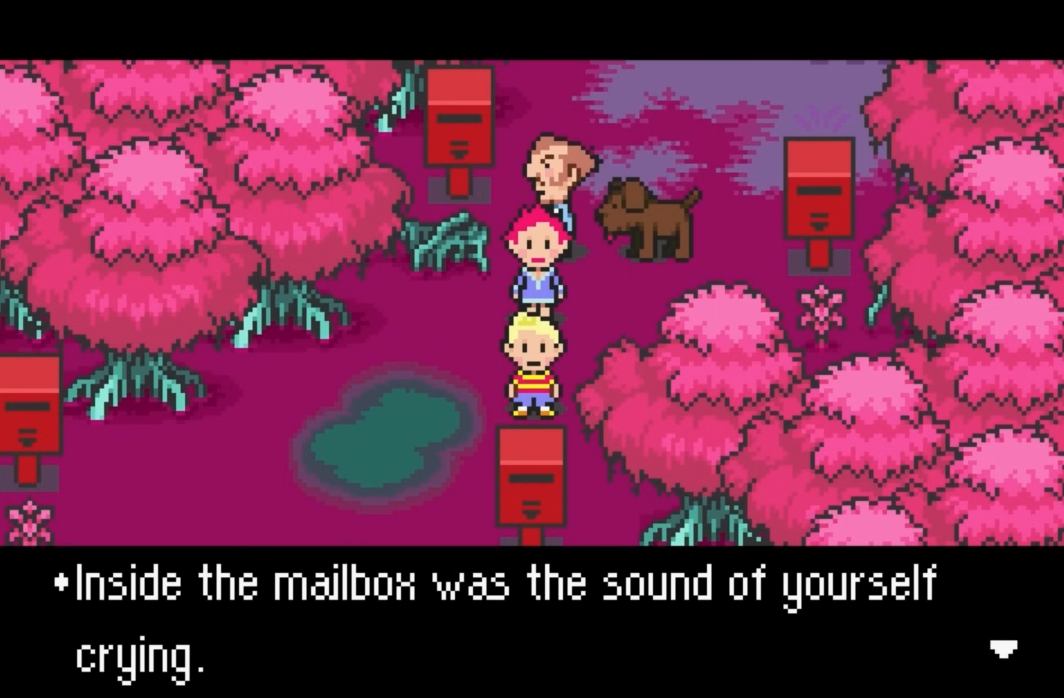 Mother 3 คือเกมแนว RPG ที่จะเต็มไปด้วยศัตรูสุดแนว และเนื้อเรื่องที่มีความลึกลับ และ แฟนตาซีแบบโยนเหตุผลหลายๆอย่างทิ้งไปได้เลย โดยตัวเกมจะมีโซนนึงที่เต็มไปด้วยกล่องจดหมายปริศนา โดยภายในกล่องจะเต็มไปด้วยข้อความที่รุนแรงและน่ากลัวไม่เหมาะกับธีมของเกมเท่าไหร่นักแม้ Mother 3 จะมีความลึกลับอยู่บ้าง โดยข้อความก็มี ” คุณมองไปภายในกล่องจดหมาย… มันเต็มไปด้วยเสียงกรีดร้อง เสียงกรีดร้องที่ดังไม่หยุด ” ” คุณมองเข้าไปในกล่องจดหมาย มีใครบางคนมองกลับมา ” ” คุณมองเข้าไปในกล่องจดหมาย คุณเจอตัวคุณเองนั่งร้องไห้อยู่ ” ” คุณมองเข้าไปในกล่องจดหมาย มันเต็มไปด้วยศพของหนู 1000 ตัว ”