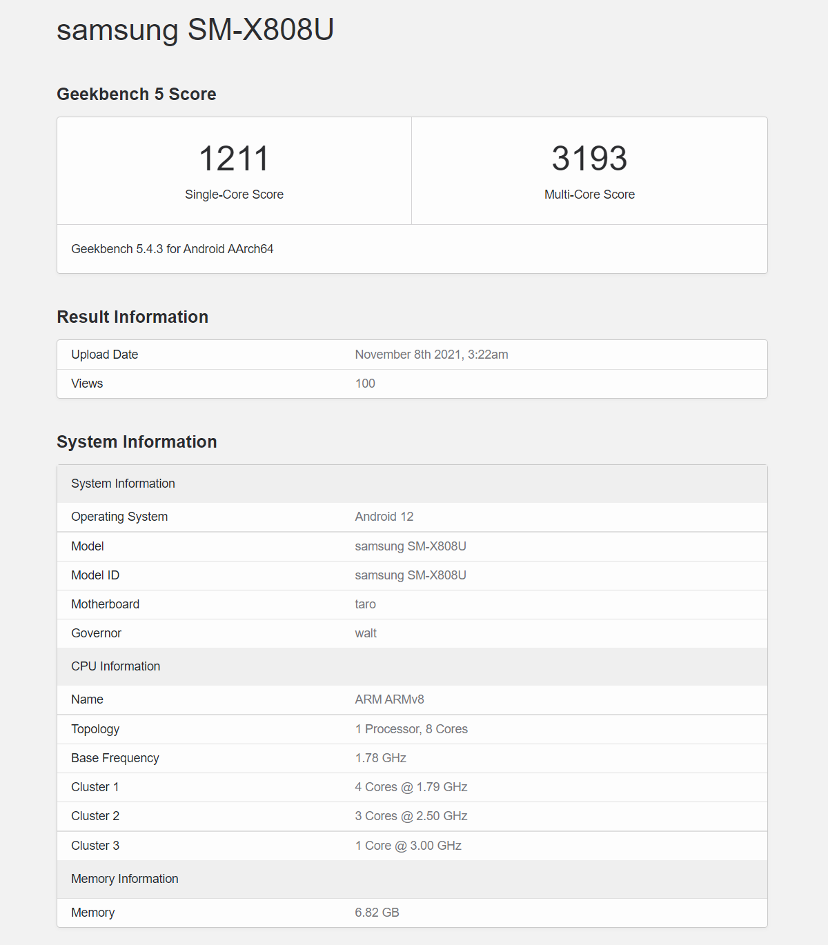 โมเดลของ Samsung ที่พบบน Geekbench คือ Samsung SM-X808U ซึ่งเป็น Samsung Galaxy Tab S8+ รุ่น 5G ที่วางจำหน่ายในสหรัฐอเมริกา มี RAM 8GB ระบบปฏิบัติการ Android 12 ทำคะแนนบน Geekbench แบ่งเป็น Single-core ได้ 1,211 คะแนน และ Multi-core ได้ 3,193 เมื่อเปรียบเทียบกับ Galaxy S22+ ที่ใช้ Exynos 2200 ทำคะแนน Single-core ได้ 1,073 คะแนน ส่วน Multi-core ได้ 3,389 คะแนน