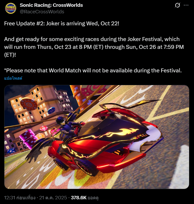 Sega ประกาศอัปเดตใหญ่ครั้งที่สองของ Sonic Racing: CrossWorlds จะปล่อยให้เล่นฟรีในวันที่ 22 ตุลาคมนี้ โดยเพิ่ม Joker ตัวละครจากซีรีส์ Persona มาเป็นนักแข่ง พร้อมเปิดเทศกาลพิเศษที่จัดขึ้นระหว่างวันที่ 23–26 ตุลาคม เพื่อให้ผู้เล่นร่วมแข่งขัน รับรางวัลลิมิเต็ด และเก็บตั๋วพิเศษในเกม