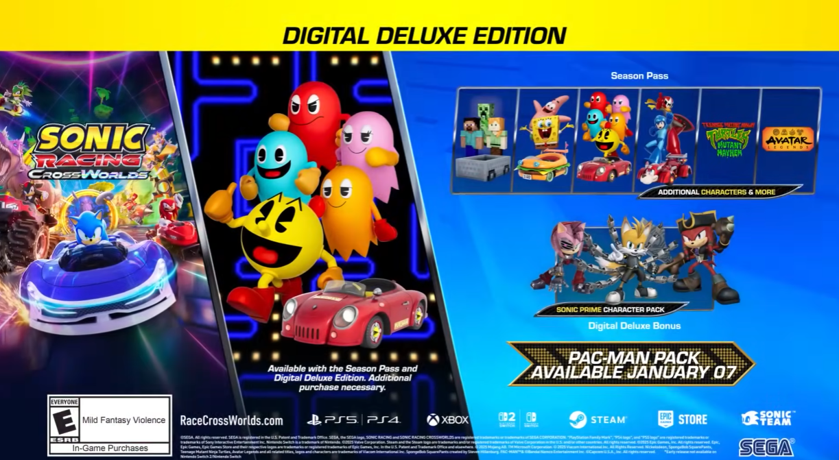 Sonic Racing: CrossWorlds กำลังปล่อยเซอร์ไพรส์ครั้งใหม่กับ DLC ชุด Pac-Man Pack ที่หยิบเอาไอคอนระดับตำนานของวงการเกมมาเติมสีสันให้สนามแข่ง ตัวอย่างทีเซอร์ล่าสุดเผยให้เห็นทั้งบรรยากาศสุดคลาสสิกและลูกเล่นใหม่ๆ ที่ออกแบบมาเฉพาะแฟน Pac-Man และแฟนเกมซิ่งของ SEGA