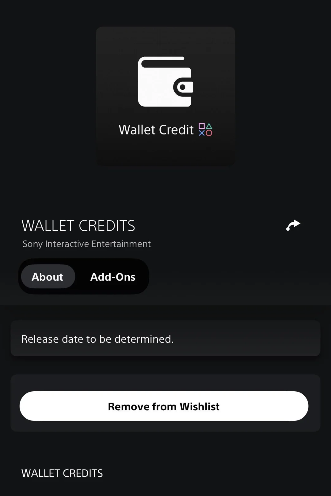 หน้าเพจดังกล่าวยังเปิดให้เพิ่มเข้ารายการที่อยากได้ และถูกจัดหมวดหมู่ในลักษณะเดียวกับแอปหรือส่วนเสริม ซึ่งแตกต่างจากระบบเติมเงินปกติที่มีอยู่แล้วบน PlayStation Store ยิ่งตอกย้ำความเป็นไปได้ว่า Wallet Credit นี้อาจเกี่ยวข้องกับการได้รับเครดิตจากกิจกรรมบางอย่าง