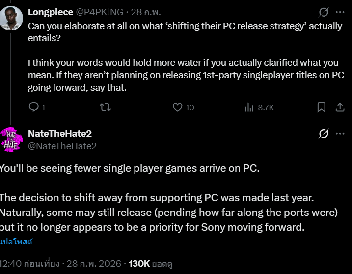 ข้อมูลจาก NateTheHate ระบุว่า Sony ได้ตัดสินใจตั้งแต่ปีที่แล้วว่าจะลดจำนวนเกมแนว Single-Player ที่พอร์ตลง PC ลงอย่างชัดเจน โดยในอนาคตอาจเน้นเฉพาะเกมแนว GAAS หรือ Game as a Service ซึ่งเป็นเกมที่ให้บริการระยะยาว มีระบบออนไลน์ และอัปเดตคอนเทนต์อย่างต่อเนื่อง เช่น ซีซันใหม่ อีเวนต์ หรือไอเทมเพิ่มเติม