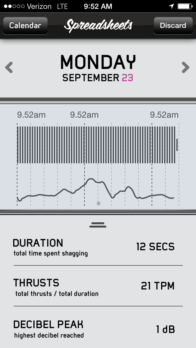 Spreadsheets จะเป็นแอพพลิเคชั่นที่จะใช้ความสามารถในการวัดระดับเสียง เซ็นเซอร์เคลื่อนไหว มาเก็บสถิติในกิจกรรมการร่วมเพศของเราครับ เร็วแค่ไหน ทนแค่ไหน สะเด็ดสะเด่าเร่าร้อนจนอดแผดเสียงร้องกันไม่ไหว ยิ่งได้คะแนนดี งานนี้มีเก็บสถิติ แถมมีฮาแชร์โชว์เข้าเฟสบุ๊คกันได้เลยครับ ^^