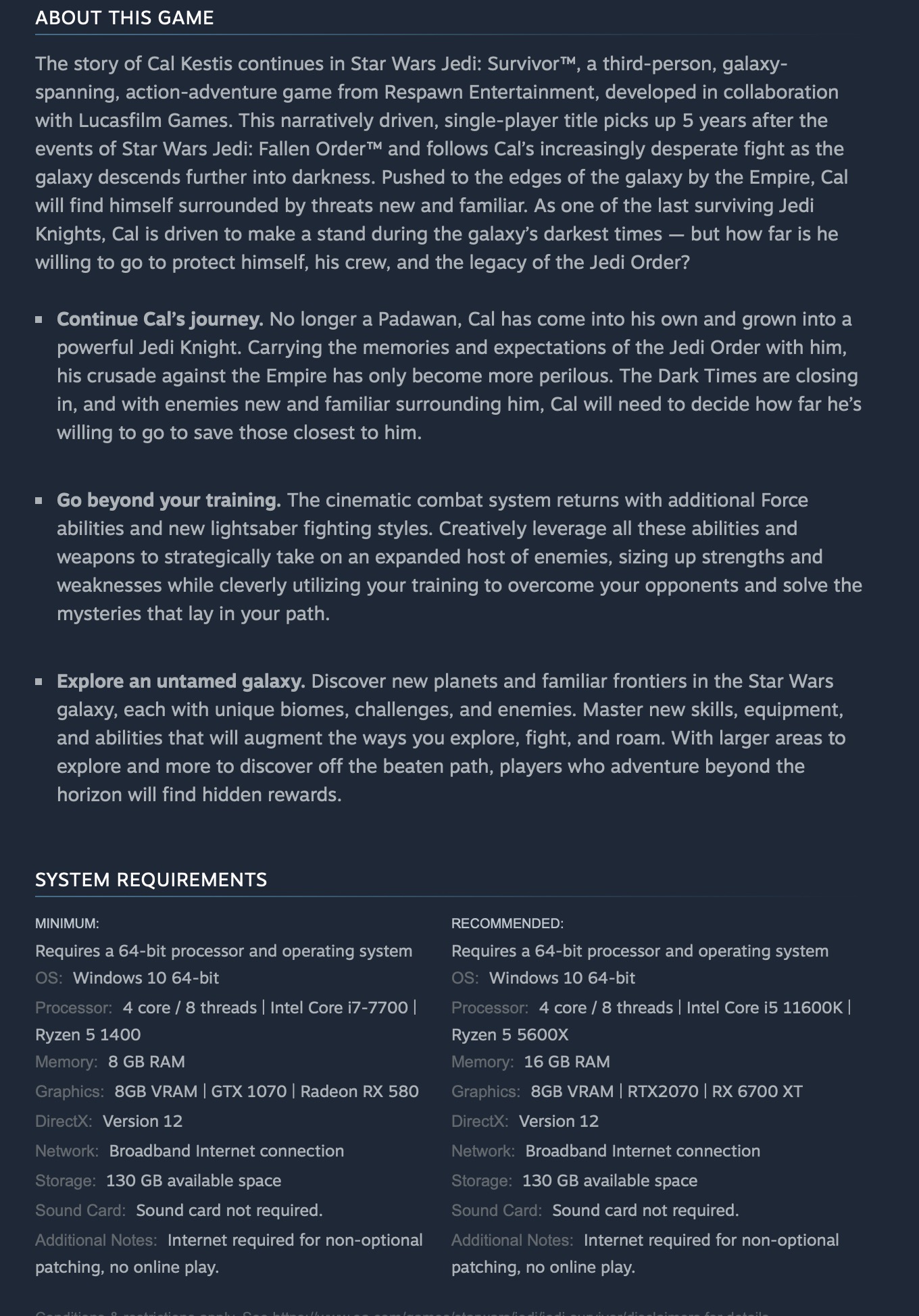 ล่าสุดผู้ใช้ทวิตเตอร์ชื่อ Wario64 ออกมาเปิดเผยว่า Star Wars Jedi: Survivor มีกำหนดวางขายในวันที่ 23 มีนาคม 2023 บน Steam พร้อมกับเผยเนื้อหาต่าง ๆ ที่จะได้รับเมื่อคุณสั่งซื้อเกมล่วงหน้าและสเปกขั้นต่ำและขั้นแนะนำของเกม หลังจากนั้นไม่นานคุณ Geoff Keighley ก็ยืนยันว่าในงาน The Game Awards 2022 จะมีการปล่อยเกเพลย์ของเกมนี้เป็นที่แรกของโลกอีกด้วย