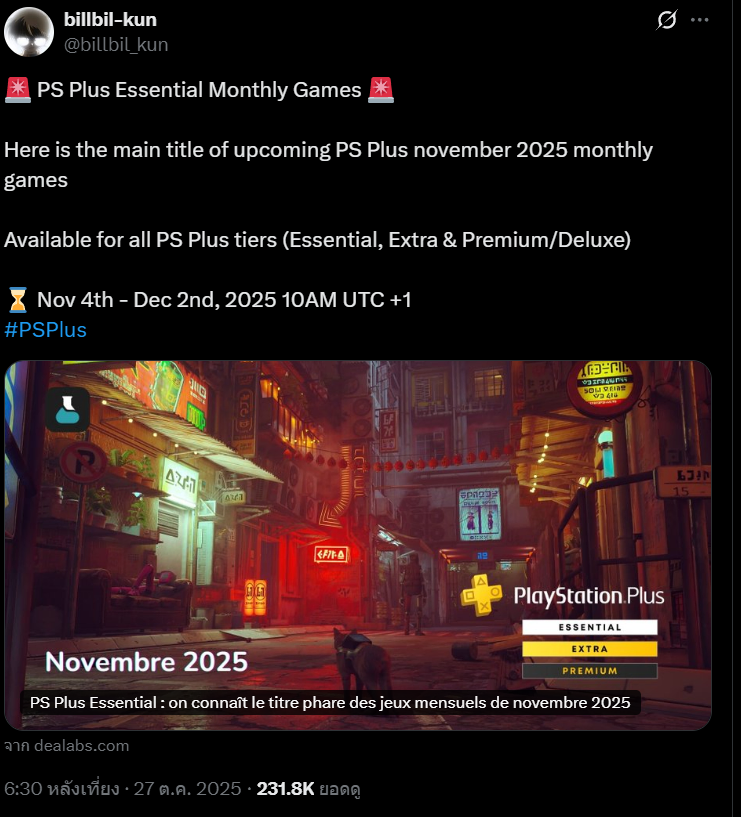 Billbil-Kun แหล่งข่าววงในที่เชื่อถือได้จาก Dealabs เผยว่า Stray จะเป็นหนึ่งในสามเกมฟรีของผู้ใช้ PS Plus Essential ประจำเดือนพฤศจิกายน 2025 โดยจะเปิดให้ดาวน์โหลดตั้งแต่วันที่ 4 พฤศจิกายนนี้ ถือเป็นโอกาสทองของแฟนเกมที่ยังไม่เคยสัมผัสเกมแมวผจญภัยชื่อดังเกมนี้มาก่อน