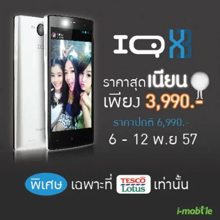 โปรโมชั่นหั่นราคาโหด I-Mobile IQ X3 ลดราคาเหลือเพียง 3,990 บาท (จาก 6,990 บาท) เฉพาะ Tesco Lotus เท่านั้น