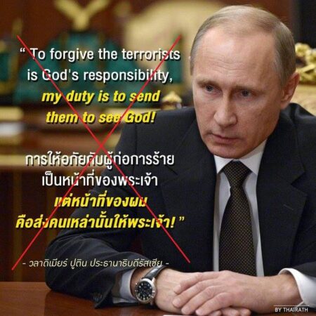 ปูติน ไม่ได้กล่าวเอาไว้ว่า “การให้อภัยผู้ก่อการร้ายเป็นหน้าที่พระเจ้า แต่หน้าที่ผมคือส่งคนเหล่านั้นให้กับพระเจ้า”