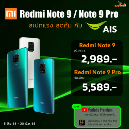 คุ้มกว่านี้ไม่มีแล้ว AIS เปิดขายสมาร์ทโฟนตัวคุ้มสุด Redmi Note 9 / Note 9 Pro ในโปรโมชั่นที่ถูกลงไปอีก พร้อมรับ YouTube premium ฟรี!