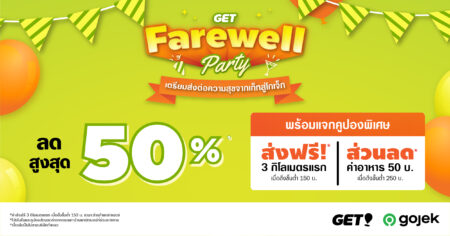 GET เปิดแคมเปญ “GET Farewell Party”ก่อนเปลี่ยนแบรนด์เป็น Gojek ยกขบวนร้านอาหารดังลดสูงสุด 50% แถมโปรค่าส่งฟรี!