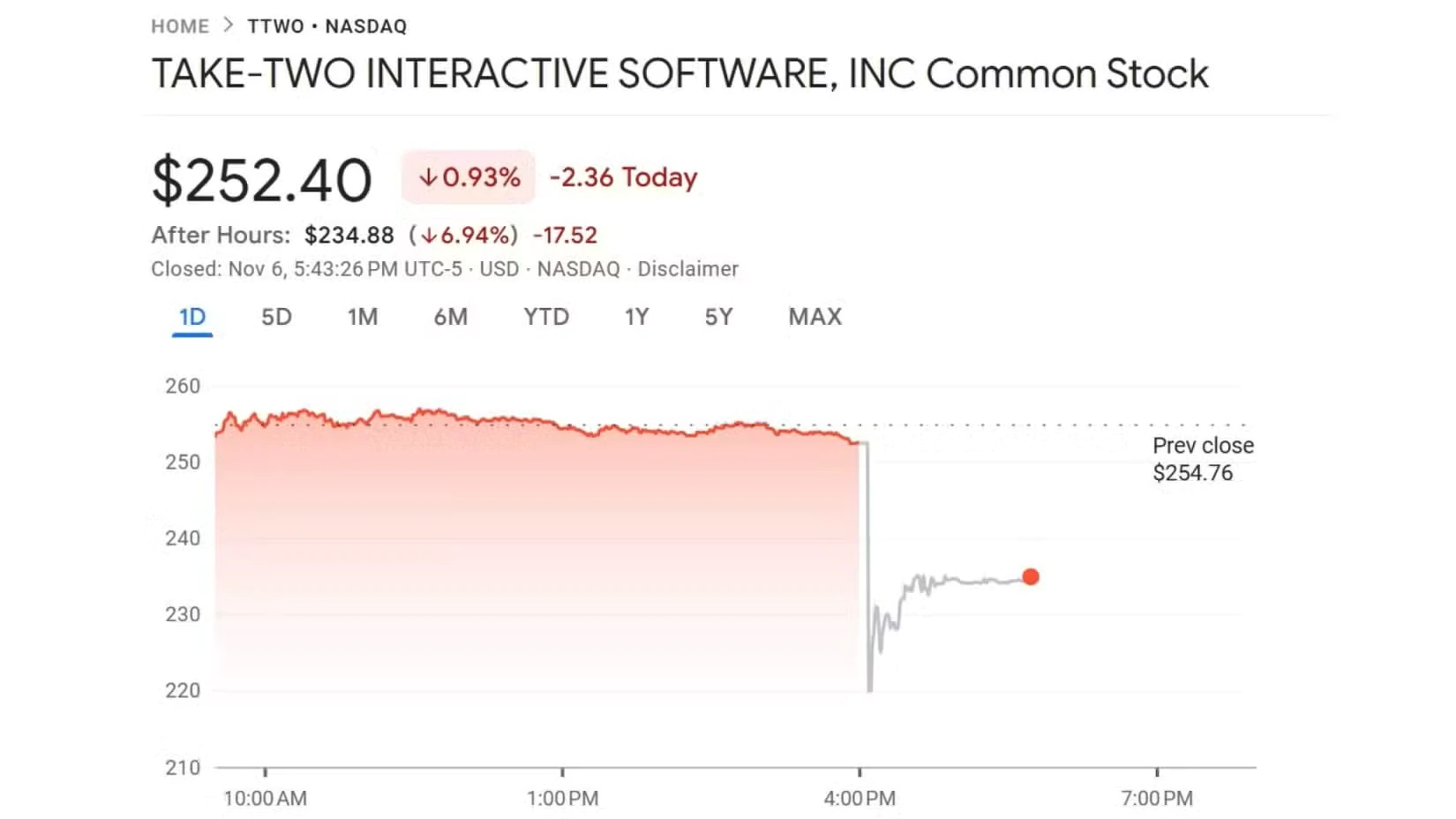 แม้หลังจากนั้นราคาหุ้นจะค่อย ๆ ฟื้นขึ้นมาอยู่ราว 234.88 ดอลลาร์ แต่ยังคงลดลงกว่า 6.94% จากวันก่อนหน้า และเมื่อเทียบกับจุดสูงสุดที่ 262.29 ดอลลาร์เมื่อช่วงปลายเดือนตุลาคม หุ้นของ Take-Two สูญเสียมูลค่ามากกว่า 42 ดอลลาร์ในรอบหนึ่งเดือน สะท้อนแรงกดดันจากการเลื่อนเกมที่เป็นเครื่องจักรทำเงินสำคัญที่สุดของบริษัท