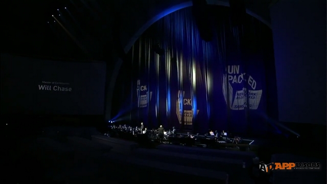 Mr Will Chase ผู้ดำเนินรายการหลักของค่ำคืนนี้ พร้อมวงดนตรีบนเสตทที่ลอยขึ้นอย่างช้าๆ คนดูปรบมือต้อนรับ งานเปิดตัว Samsung Galaxy S4 เริ่มแล้ว