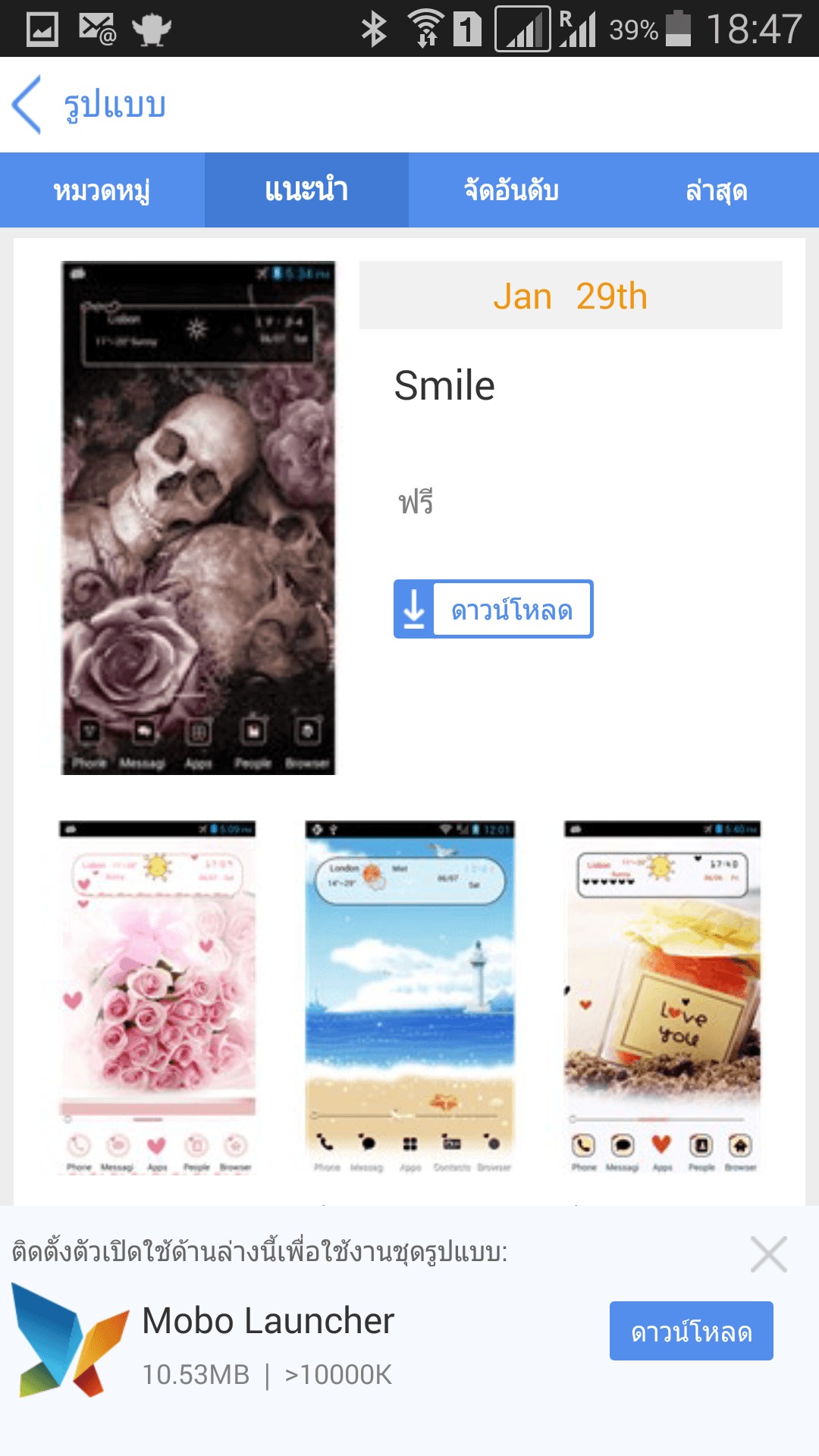 มีมาพร้อมทั้งธีมสวยๆ เอามาแต่งเครื่อง โดยธีมเหล่านี้จะต้องใช้งานร่วมกันกับแอพพลิเคชั่น Mobo Launcher นะครับ ซึ่งหาได้จากใน MoboMarket เช่นกัน