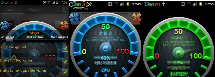 แจ้งเปอเซ็นการทำงาน CPU ความร้อน แล แบตเตอรี่ ตัวเดียวได้ถึง3 จะให้แสดงกดเข้าแอพเลือกได้เลยครับ ^^