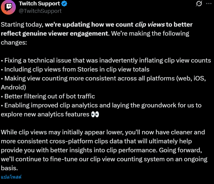 Twitch ประกาศเมื่อวันที่ 19 พฤศจิกายนว่าเริ่มปรับปรุงระบบการนับยอดรับชมคลิป เพื่อรับมือกับปัญหา viewbot ที่กระทบแพลตฟอร์มมานาน โดยยอดวิวของคลิปจะถูกนับรวมจาก Stories และแพลตฟอร์มที่รองรับทั้งหมด ทำให้สถิติบนเดสก์ท็อปและมือถือสอดคล้องกันมากขึ้น อย่างไรก็ตาม Twitch ระบุว่ายอดวิวในช่วงแรกอาจลดลงก่อนที่ระบบใหม่จะทำงานเต็มประสิทธิภาพ