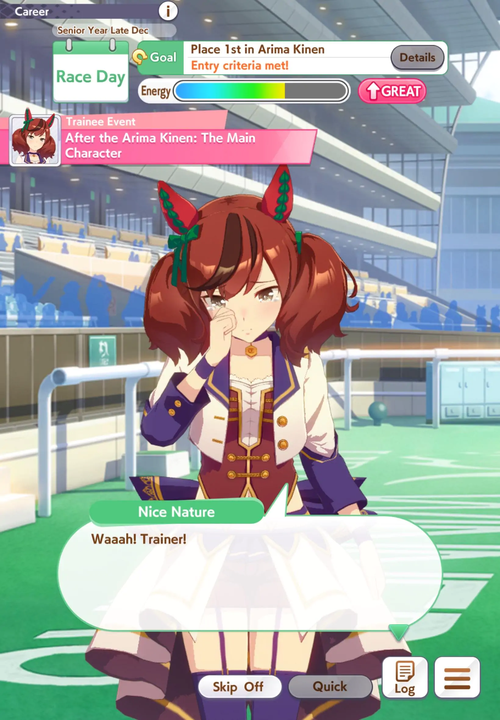 และนอกจากการสนใจกีฬาแข่งม้าแล้ว ก็ยังมีการช่วยเหลือเหล่าม้าที่มีตัวตนจริงๆจากในเกมด้วย เช่นการส่งหญ้าหวานไปให้ Haru Urara ตัวละครโปรดของผู้เล่นในเกม หรือการซ่อมคอกม้าให้กับ Nice Nature ก็เช่นกัน