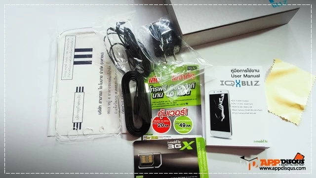 ประกอบด้วย ตัวเครื่อง, ฟิล์มกันรอย, เคส, คู่มือภาษาไทย, ใบรับประกัน, สาย USB Data, Adaptor ชาร์จไฟ, Sim i-Mobile 3GX