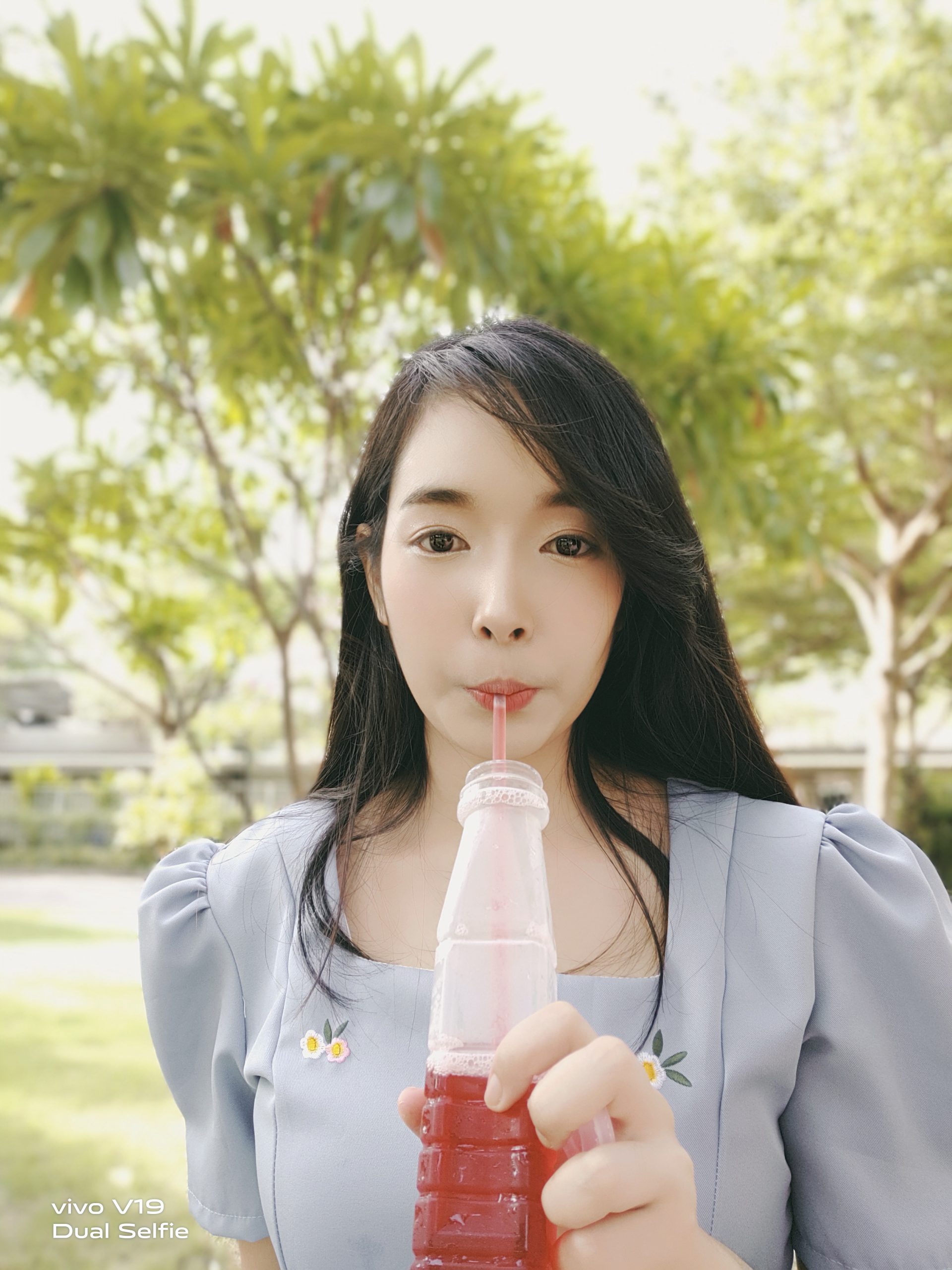 ภาพเซลฟี่กล้องหน้าของ Vivo V19 ผลลัพท์ออกมาสวยมากทีเดียวครับ กล้องหน้าเครื่องเดียว สร้างภาพเซลฟี่ของเราออกมาได้หลากหลายโทน จะเติมความมุ้งมิ้งด้วย AR เซลฟี่กันสักหน่อย ก็มีให้เล่นเยอะอยู่ครับสำหรับสติ๊กเกอร์