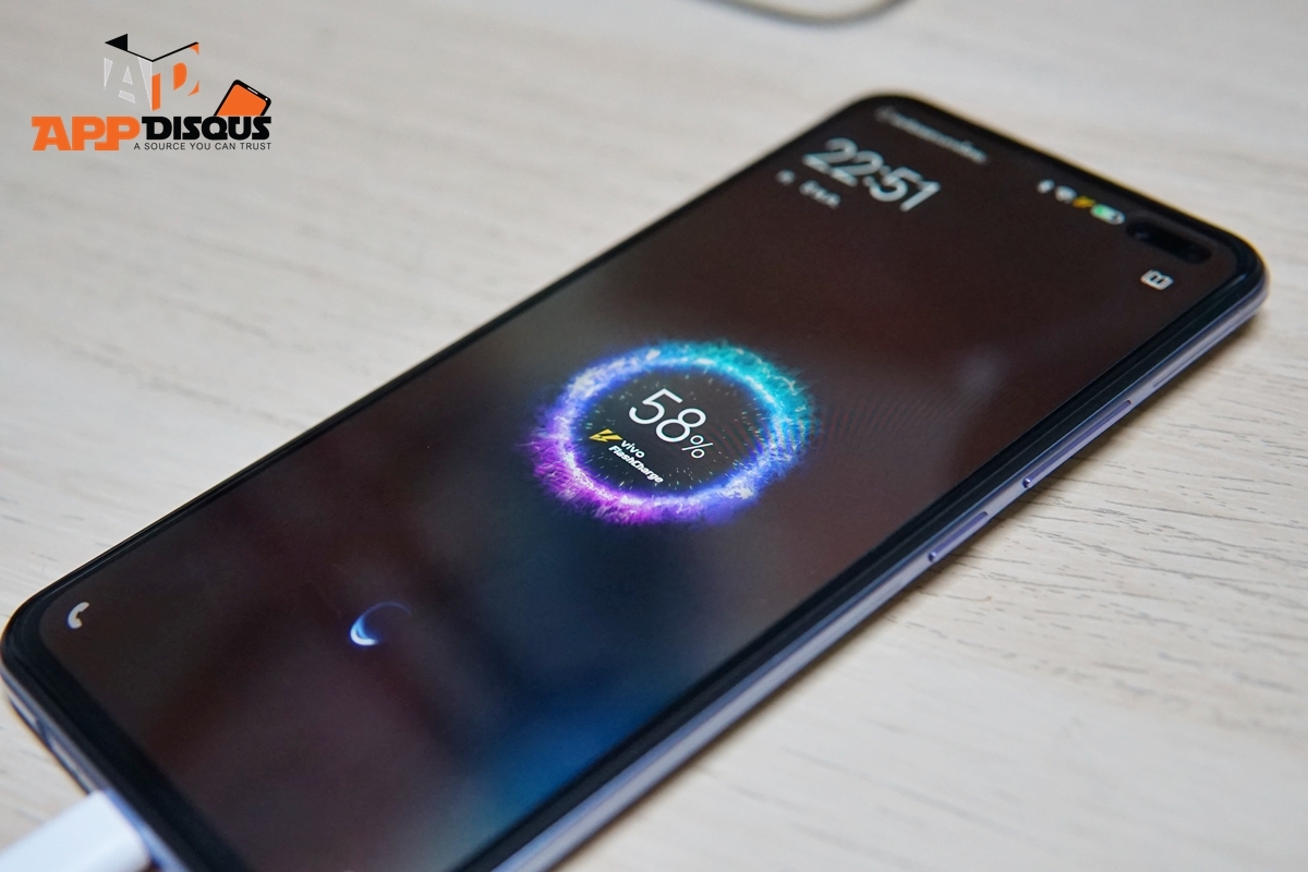ตัวเครื่องไม่หนาไม่ใหญ่ แต่ใส่แบตเตอรี่เอาไว้ให้ถึง 4,500 mAh จากที่ทดสอบ สามารถใช้งานได้ต่อเนื่องกว่าสิบชั่วโมงเลยครับสำหรับการเปิดหนังเล่นเกมตลอดทั้งวัน และรองรับระบบการชาร์จไว 33W Vivo FlashCharge 2.0 ด้วยอุปกรณ์ที่มีมาให้ภายในกล่อง ซึ่งจะแสดงให้เราเห็นว่าตัวเครื่องมีการชาร์จอยู่ทั้งในขณะหน้าจอยังล็อคและปลดล็อคอยู่แล้วด้วยครับ