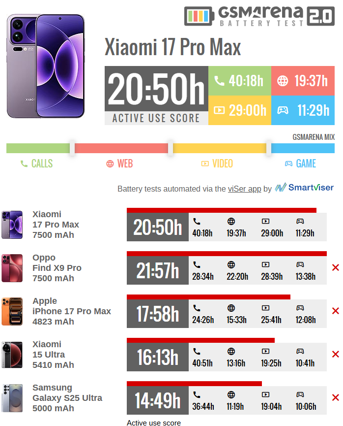 จากการทดสอบอัตโนมัติด้วยระบบ Smartviser viSer App พบว่า Xiaomi 17 Pro Max ทำเวลาสนทนาได้นานกว่า 40 ชั่วโมง, เล่นเว็บได้ 19 ชั่วโมง 37 นาที, ดูวิดีโอได้ 29 ชั่วโมง, และเล่นเกมต่อเนื่องได้ถึง 11 ชั่วโมง 29 นาที