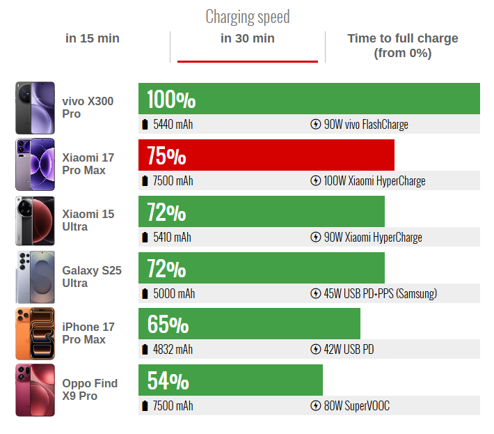 เมื่อเทียบกับรุ่นพลังใกล้เคียง เช่น Oppo Find X9 Pro (80W SuperVOOC) ที่ทำได้ 54% ในเวลาเท่ากัน Xiaomi ถือว่าชนะไปอย่างชัดเจน แม้จะมีแบตเตอรี่ขนาดใหญ่กว่าก็ตาม