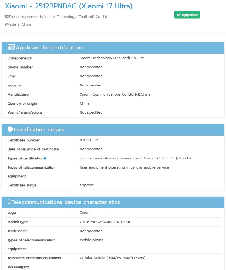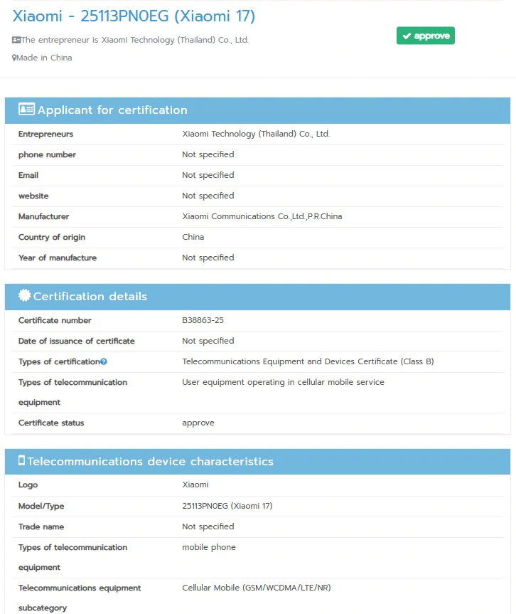 ขณะที่ในประเทศไทย ทั้ง Xiaomi 17 และ Xiaomi 17 Ultra เวอร์ชัน Global ก็ปรากฏในฐานข้อมูลของ กสทช. (NBTC) เช่นกัน โดยใช้หมายเลขรุ่น 2512BPNDAG และ 25113PN0EG สะท้อนว่าการเปิดตัวในตลาดไทยอาจไม่ไกลเกินรอ