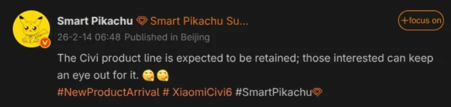 ก่อนหน้านี้ในเดือนตุลาคม เคยมีรายงานระบุว่า Xiaomi อาจยกเลิกการเปิดตัวสมาร์ตโฟน Civi 6 ในจีน ทำให้หลายคนคิดว่าอนาคตของสมาร์ตโฟนซีรีส์นี้อาจจะไม่ทำตลาดอีกต่อไป แต่ล่าสุดมีข้อมูลใหม่จากจีนที่รายงานว่ารุ่นนี้ยังคงอยู่ในแผนพัฒนา หลังจากสองทิปสเตอร์ชื่อดังอย่าง Smart Pikachu และ Digital Chat Station ออกมาเผยเบาะแสใหม่บน Weibo