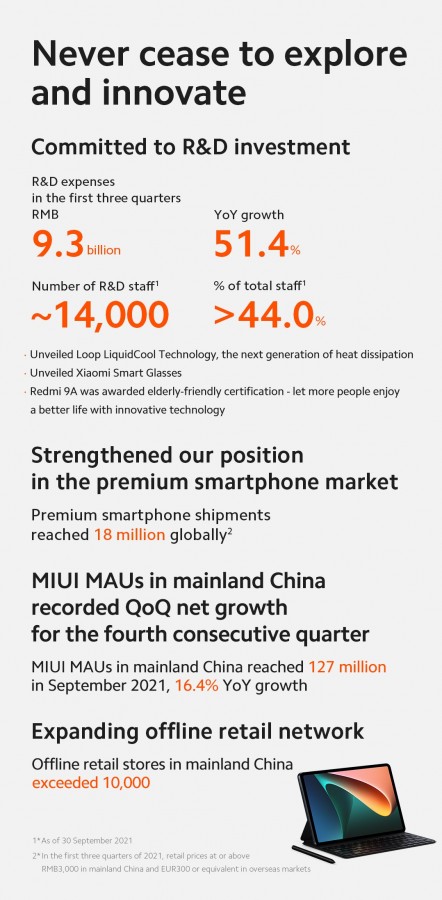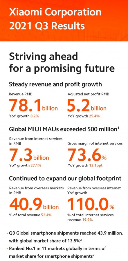 ทาง Xiaomi Group ได้เผยแพร่รายงานผลประกอบการประจำไตรมาสที่ 3 เผยให้เห็นตัวเลขที่น่าประทับใจหลายอย่าง เช่น ปัจจุบัน MIUI มีผู้ใช้งานมากถึง 500 ล้านคนต่อเดือน อีกทั้งยังเป็นแบรนด์ TV อันดับ 1 ในประเทศจีนอีกด้วย